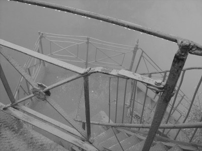 Stare schodki prowadzące na Sokolik Duży. We mgle.