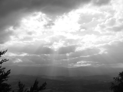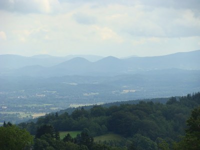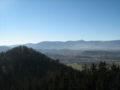 Widok z Sokolika na Krzyżną Górę oraz Karkonosze.