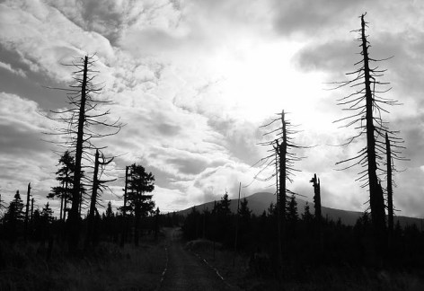 Tablica pomagająca czasami w nawigacji. Wiele osób nie lubi w krajobrazie martwych drzew… Jakkolwiek przy całym tragizmie różnego rodzaju katastrof ekologicznych w Sudetach (m.in. w Karkonoszach), są one nieodłączną częścią ich wyjątkowego pejzażu.Podczas jednego z jesiennych wyjazdów udało nam się cieszyć najpierw piękną jesienią, a następnie – bodaj – drugim solidnym opadem śniegu w owym sezonie. Klimat w sam raz do śpiewania kolęd 🙂