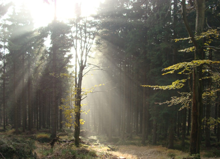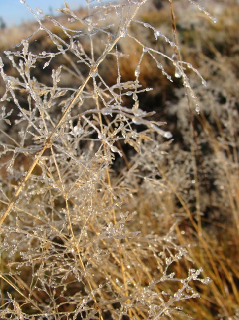 Izerskie trawy w porannych kryształkach lodu.Kuszą kolory drzew – po polskiej stronie głównie modrzewie będą nam urozmaicać mrok świerków, po czeskiej zaś w wielu miejscach będzie na nas czekać buczyna. [Ten ostatni fakt wywołał u nas niemały szok, gdyśmy go odkryli kiedyś latem. Wszak większości ludzi Izery kojarzą się z lasami świerkowymi – jej żyjącymi fragmentami, które są dość nudne latem, za to bywają magiczne zimą; a jeszcze bardziej może z połaciami umarłych na skutek katastrofy ekologicznej drzew. Te fragmenty są moim zdaniem – jakkolwiek okrutnie to zabrzmi – inspirujące, a przy tym dają możliwość podziwiania widoków]. Co prawda obecność buczyny to zasadniczo przywilej czeskiej strony gór (o niej będzie kiedyś osobny wpis, ponieważ zaskakuje powierzchnią, rozmaitością i odmiennością od polskiej strony gór), ale i u nas można spotkać czasami niespodzianki.