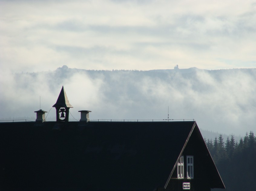 Muzeum Gór Izerskich w Izerce, a nad nim Szrenica i stacja nad Śnieżnymi Kotłami.