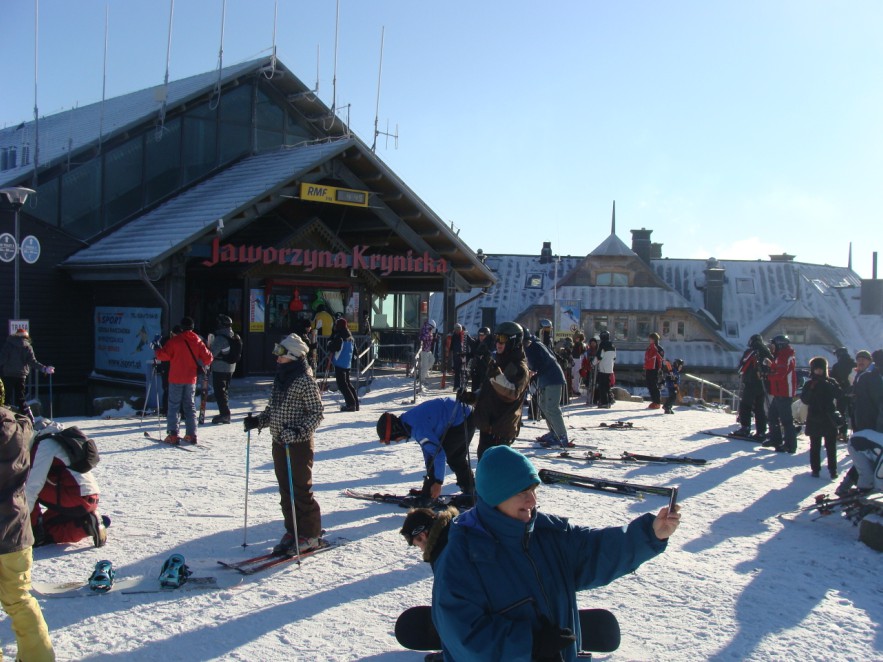 W tym miejscu trzeba też wspomnieć o samej Jaworzynie Krynickiej, którą jeśli jest się zimowym piechurem, najlepiej omijać szerokim łukiem. Mocno zdewastowany wszelką infrastrukturą (nazwijmy ją umownie „piwno-golonkowo-wyciągową”) szczyt, zimą pokazuje swoje ekstremalne oblicze – hałas wszelkiej maszynerii, dźwięki dochodzące z licznych głośników, tłok, woń alkoholu unosząca się niczym smog nad pstrokatymi narciarzami i nieustanna walka, by ktoś na nas nie wjechał (i nie chodzi bynajmniej o – słusznie zabronione zresztą w każdym cywilizowanym świecie – chodzenie po stoku).