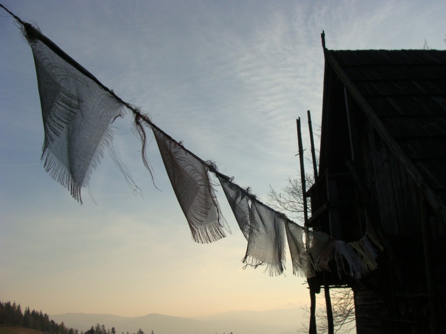Buddyjskie chorągiewki modlitewne przed Chatką pod Niemcową.Wypada jeszcze wspomnieć o schronisku na Przehybie, choć przystępuję do tego z pewną trudnością… Nie nocowaliśmy tam, póki co. Przechodziliśmy kilkukrotnie natomiast, i nie możemy oprzeć się wrażeniu, że za każdym razem spotyka nas tam coś dziwnego. A to w środku dnia ludzie wyganiani są z jadalni, bo „będzie sprzątane”, a to pan w okienku (brzmi jakby dotyczyło pracownika urzędu, ale zapewniam, że trochę tak to wygląda, prócz tego, że na Przehybie schylać trzeba się okrutnie, a w większości urzędów już nie…) jest – znów – wyjątkowo niemiły. Pomidorówka z zarastającym widokiem na Tatry i Pieniny była całkiem, całkiem, ale to niestety za mało, by zostawić dobre wspomnienie. Hmm, a może to ten maszt jakieś złe fale tam powoduje?…