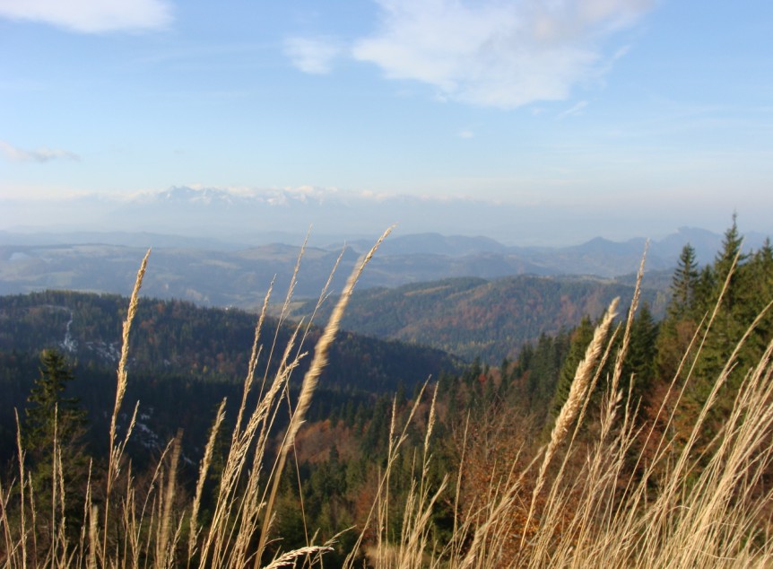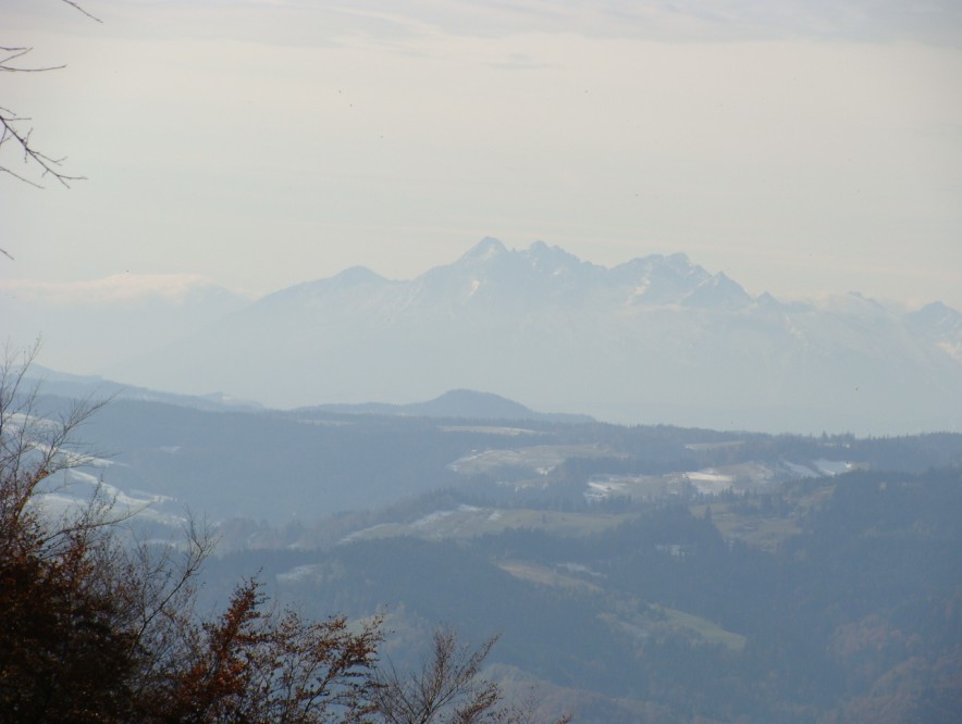 Widok z Jaworzyny Kokuszczańskiej.Na tle Tatr wyraźny zarys Wysokiej w Małych Pieninach.