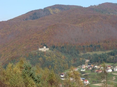 Jesienny widok znad Rytra na ruiny zamku.