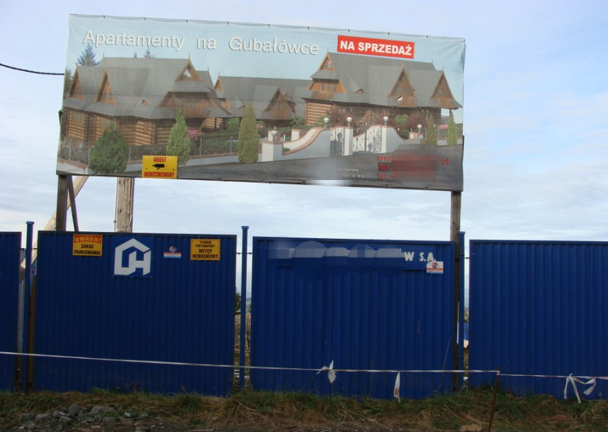 Na tym nie koniec. Idąc w kierunku Butorowego Wierchu, mijaliśmy również plac budowy z mocno wyblakłą tablicą informacyjną. Trudno powiedzieć, co smutniejsze – rozkopana, ogrodzona działka, na której chyba nic się nie dzieje, czy perspektywa zabudowania każdej wolnej przestrzeni w okolicy…