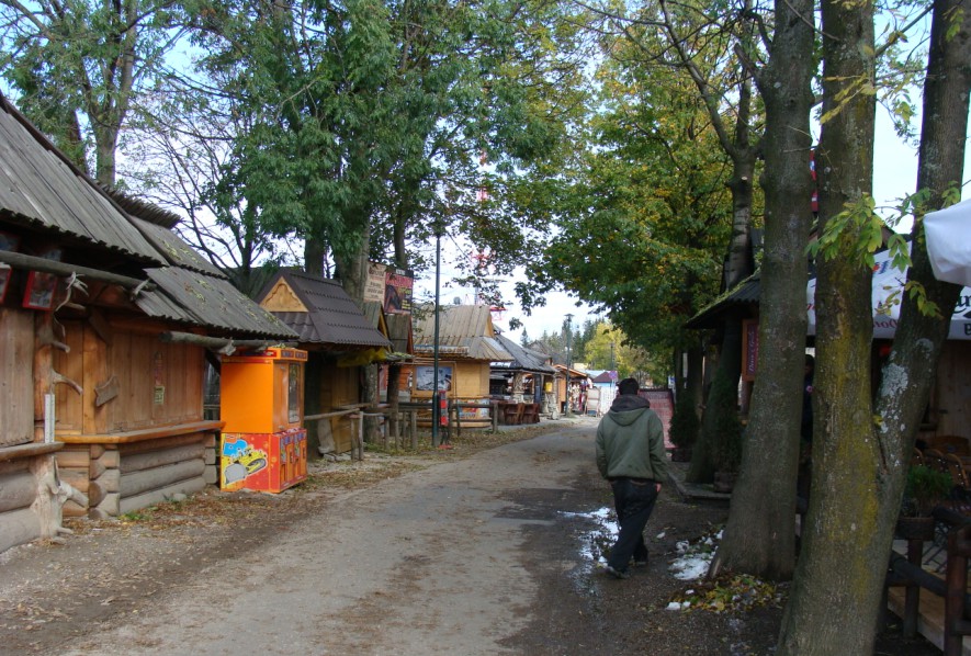 Widok z zatoczki przed barem FIS (z której cały sezon słychać pokrzykiwania kierowców busów) w kierunku dworca PKS.Niedawno, jesienią, korzystając z „pozasezonowości”, wybraliśmy się na krajoznawczą wycieczkę na Gubałówkę. Oboje dawno tam nie byliśmy. Człowiek wie, że panorama stamtąd piękna i pouczająca, tyle, że w sezonie odczuwamy instynktowną obawę przed tym zatłoczonym miejscem, no i zazwyczaj do zdobycia są jeszcze jakieś inne góry w okolicy 😉