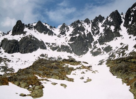 Dno doliny w czerwcu zazwyczaj jest już całkowicie wolne od pokrywy śniegowej (za to pełne spływającej strumieniami wody), ale płaty śniegu, zwłaszcza na zacienionych stokach (np. Szpiglasowego Wierchu), w zależności od pogody, mogą utrzymywać się nawet na początku lipca. Tutaj widok na Wielki Staw, Opalony Wierch oraz Tatry Bielskie (po lewej, na horyzoncie).