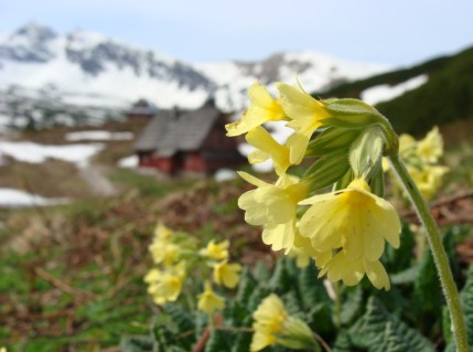 W maju, gdy pokrywa śniegu wyżej, na halach jest już przerywana, a słońce chciwie wykrada kolejne fragmenty spod mokrej bieli, zaczyna się szaleństwo wiosennych kwiatów, które choć nie tak popularne (i spektakularne) jak krokusy, to przecież też cieszą oczy. Na zdjęciu pierwiosnki wyniosłe na Hali Gąsienicowej.