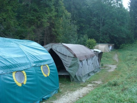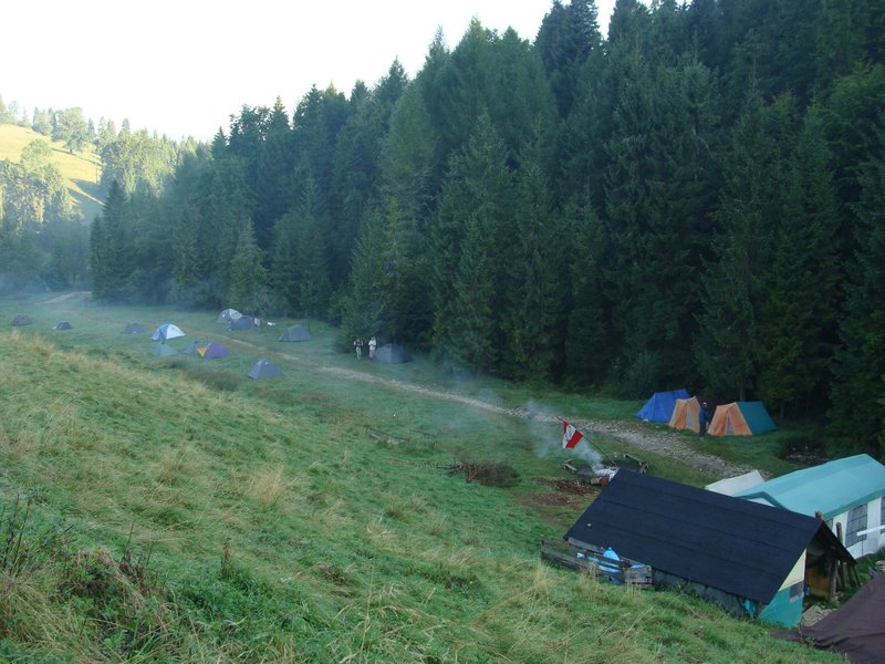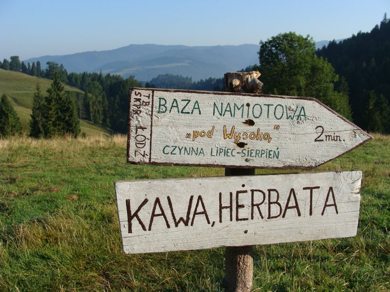 Zdjęcia zostały zrobione zanim słońce zdołało dotrzeć do tego zakątka polany. Niestety nie mieliśmy możliwości dłużej czekać, nasz poranek trwał już kilka godzin, a nam trzeba było w drogę. Po lewej widoczna wiata oraz jadalnia, po prawej, równolegle do ścieżki, namiot bazowego. Na pierwszym planie niby nic – plenerowa szuszarnia, a przecież to taka przydatna sprawa. Rzut oka na niektóre z pojemnych namiotów bazowych. Każdy z nich jest oczywiście nazwany. Wszystko jest pod ręką, po wodę nikt się nie nachodzi – potok służy do mycia, a źródełko wody pitnej jest tuż obok wiaty. Na zdjęciu „zmywarka”. Co rano śpiochów ze snu może wyrwać dźwięk owczych dzwonków i pokrzykiwania pasterzy. Widok na bazę od strony zielonego szlaku z Wąwozu Homole w kierunku Wysokiej. W tej części można rozbijać własne namioty – miejsca jest pod dostatkiem (no, może z wyłączeniem strefy zbyt bliskiej tojtojowego wychodka).Duży punkt dla bazy (a raczej bazowego), który zapytał, czy wiemy, co i gdzie, bo jak nie, to nas oprowadzi. Banalnie proste, a jednak w wielu miejscach (nie tylko na bazach) wychodzi się chyba z założenia, że jak ludzie będą czegoś potrzebować, a nie znajdą, to zapytają (wiadomo). Ale przecież zwykła ludzka życzliwość (i udzielenie najpotrzebniejszych informacji dosłownie w kilku zdaniach) jest czymś dużo więcej niż najzabawniejsze nawet drogowskazy (nie umniejszając jakkolwiek niczego bazowym tabliczkom – jedno przecież nie wyklucza drugiego). No i jeszcze jedna pozytywna sprawa, tyleż oczywista, co za każdym razem pozytywnie chwytająca nas za serce – z gór na bazę zeszliśmy wraz ze zmrokiem, bazowy zapytał nas, czy chcemy herbatę… Mimo tego, żeśmy podziękowali (dzień był bardzo, bardzo ciepły i marzyliśmy o czymś – wciąż w miarę zimnym – co było w naszym plecaku), propozycja ta wybrzmiała w naszych uszach przyjemniej niż zwykle, może dlatego, że byliśmy naprawdę solidnie zmęczeni, a bazowa herbata jakoś podskórnie kojarzy się z gościnnością i troską.