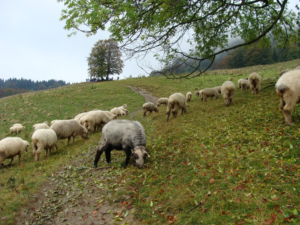 Na Przełęczy Rozdziela.Czasami natomiast można się zdziwić. Nigdy nie zapomnę, jak podczas mojego pierwszego pobytu w Pieninach (bodajże w październiku) wśród bardzo niskich chmur i przenikliwej wilgoci szłam z przyjaciółką na Trzy Korony. W pewnym momencie na niewielkiej polance zobaczyłyśmy postać – starsza pani sprzedawała oscypki. Zbaraniałyśmy tak, że kupiłyśmy to i owo, bez mrugnięcia okiem. Było to o tyle ciekawe, że w ciągu tej całej bardzo ponurej i zupełnie niewidokowej soboty spotkałyśmy może pięć osób, a szłyśmy pienińskim standardem Krościenko-Trzy Korony-Sokolica-Szczawnica (gdzie mają być ludzie, jeśli nie na tej trasie?).