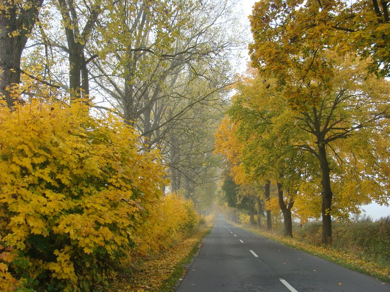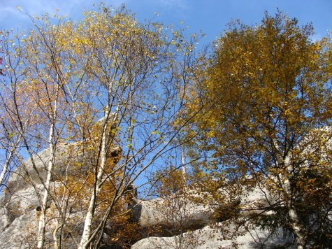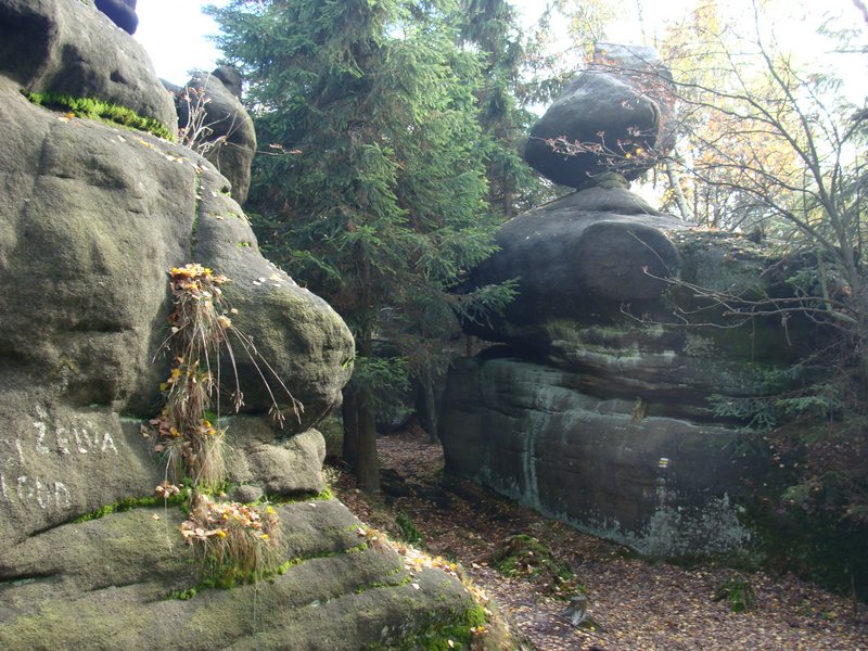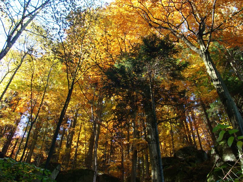Złoto towarzyszyło nam zarówno podczas marszu szosą… …jak i tworzyło bajeczne sklepienia w lasach pełnych skał… …czy współtworzyło paletę barw widzianych z góry.Im wyżej, tym liści coraz mniej, z jednej strony więc ciepłe barwy urozmaicały chłód piaskowcowych tworów…