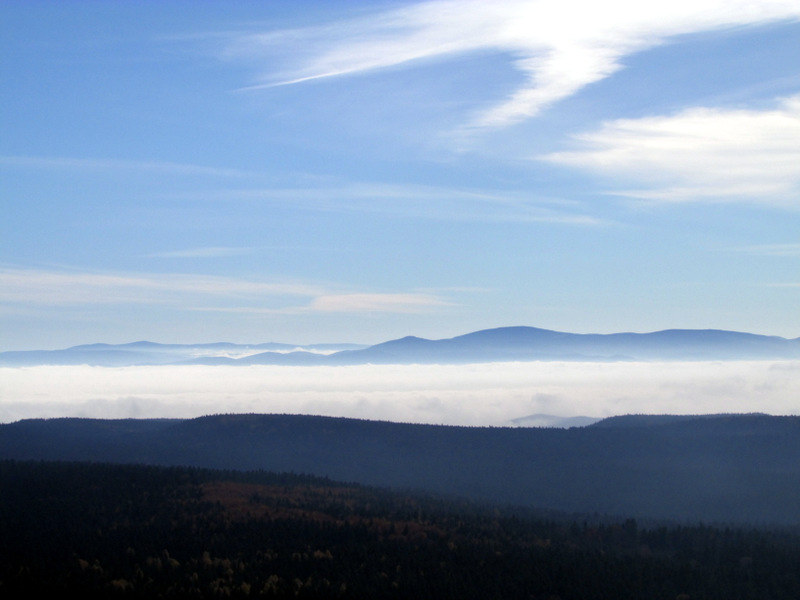 Z lewej widoczna Koruna, na horyzoncie majaczą Góry Suche z charakterystycznym, stromo ściętym kształtem Waligóry.Taniec chmur między Božanovskim Špičákiem i Koruną.
