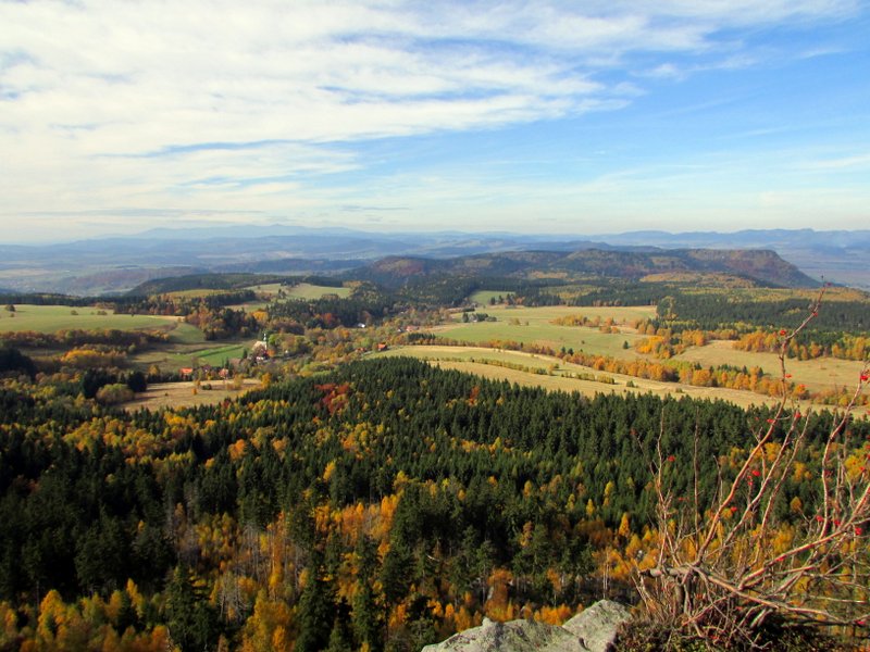 Koruna widziana ze Szczelińca.Już podczas marszu niebieskim szlakiem z Radkowa w kierunku Skalnych Wrót (warto zaznaczyć na wstępie, że poza sezonem nie ma możliwości dojazdu komunikacją publiczną do Karłowa, który dla większości turystów jest punktem startu tak na najwyższą górę w okolicy, jak i do innych sztandarowych atrakcji) zaskoczyła nas obfitość przebarwiających się drzew liściastych, w tym oczywiście również buków.