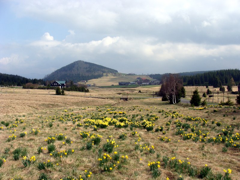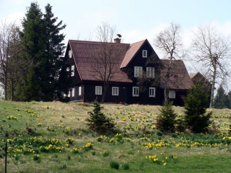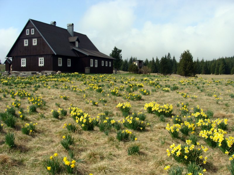 Absolutnie bajeczna łąka zdziczałych żonkili znajduje się w pobliżu Gnojowego Domu (Gnojnej Chaty?; czes. Hnojový dům), w którym od lat 60-tych do końca XX wieku mieszkał człowiek-legenda Gustaw Ginzel – Niemiec sudecki, podróżnik, zbieracz pamiątek. Prowadził on prywatne schronisko. Pierwotny kilkusetletni dom spłonął wraz z bogatą kolekcją w 1995; obecny jest rekonstrukcją. Dom jest zamknięty, ale o każdej porze roku warto zajrzeć do… wychodka🙂