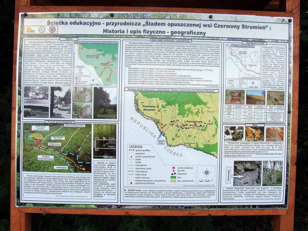 Obecnie zwiedzanie Czerwonego Strumienia jest mocno ułatwione, żeby nie powiedzieć… ucywilizowane. Tablice informują, prowadzą znaki – do wyboru mamy dwa szlaki turystyczne oraz ścieżkę dydaktyczną (wyznaczoną przez Towarzystwo Górskie „Róża Kłodzka”), która pokrywa się w najbardziej spektakularnym fragmencie z zielonymi oznakowaniami przebiegającymi przez centrum dawnej wsi. Pod koniec lipca przez zarośla nie trzeba było się przedzierać, bo trasa, którą żeśmy szli, była wykoszona. Jakkolwiek mimo tych ułatwień zobaczenie Czerwonego Strumienia, wbrew obiektywnej bliskości drogi jezdnej oraz pobliskich miejscowości, wymaga pewnego minimum wysiłku. Nie obejrzy się tego wszystkiego z okien samochodu. Na szczęście.