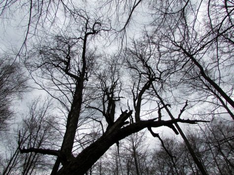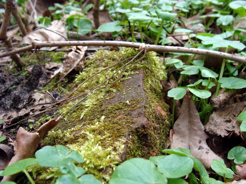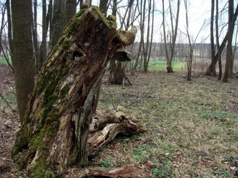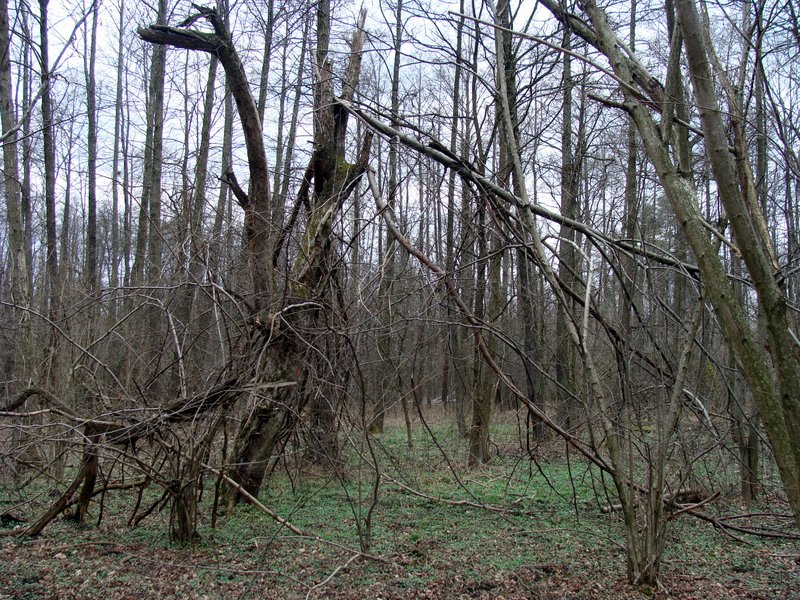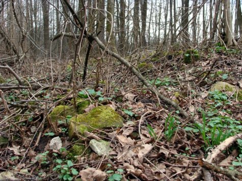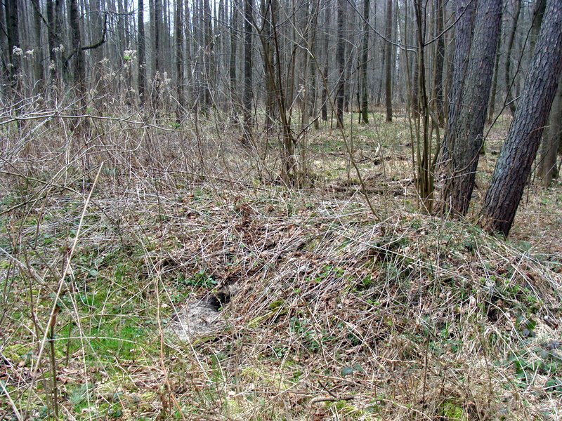 W nagim, wiosennym lesie dostrzegliśmy m.in. pagórki ruinowe, resztki cegieł i obrobionych kamieni, zarys dawnej drogi, pozostałości po starych drzewach i zdziczałe gatunki nie pasujące do lasu. Gdzieś tutaj, kiedyś była szkoła…
