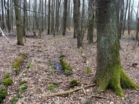 Niezbyt efektowne te ślady, prawda? Latem najpewniej niewiele się tutaj dojrzy. My i wiosną nie za dużo byśmy znaleźli, gdyby nie wcześniejsze lekcje poszukiwania pozostałości po dawnych wsiach i osiedlach. Dlatego nie aż tak bardzo zdziwiły nas zdziczałe żonkile w środku leśnych ostępów…