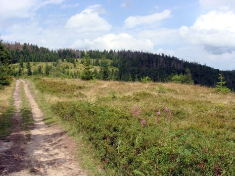 Mieczyk dachówkowaty w okolicach Marszałka (czerwony szlak Lubań-Krościenko zachwyca łąkami).Wróćmy jednak do tematu. Gdy górska łąka przestaje być użytkowana, ekspansywne gatunki biorą ją w posiadanie – stopniowo pojawiają się ziołorośla, krzewy, następnie zaś coraz śmielej stara się wkroczyć las (choć oczywiście zaczyna się niepozornie, np. od jarzębinek). Warto w tym miejscu również zauważyć, że zazwyczaj nie jest to pierwotna mieszanka gatunków drzew, jakie rosły tu w przeszłości, ale bardzo często te, które zostały w dane miejsca sprowadzone sztucznie, przez człowieka (mam na myśli rzecz jasna sprawnie rosnące świerki, które były sadzone tam, gdzie wycinano buczynę karpacką)…