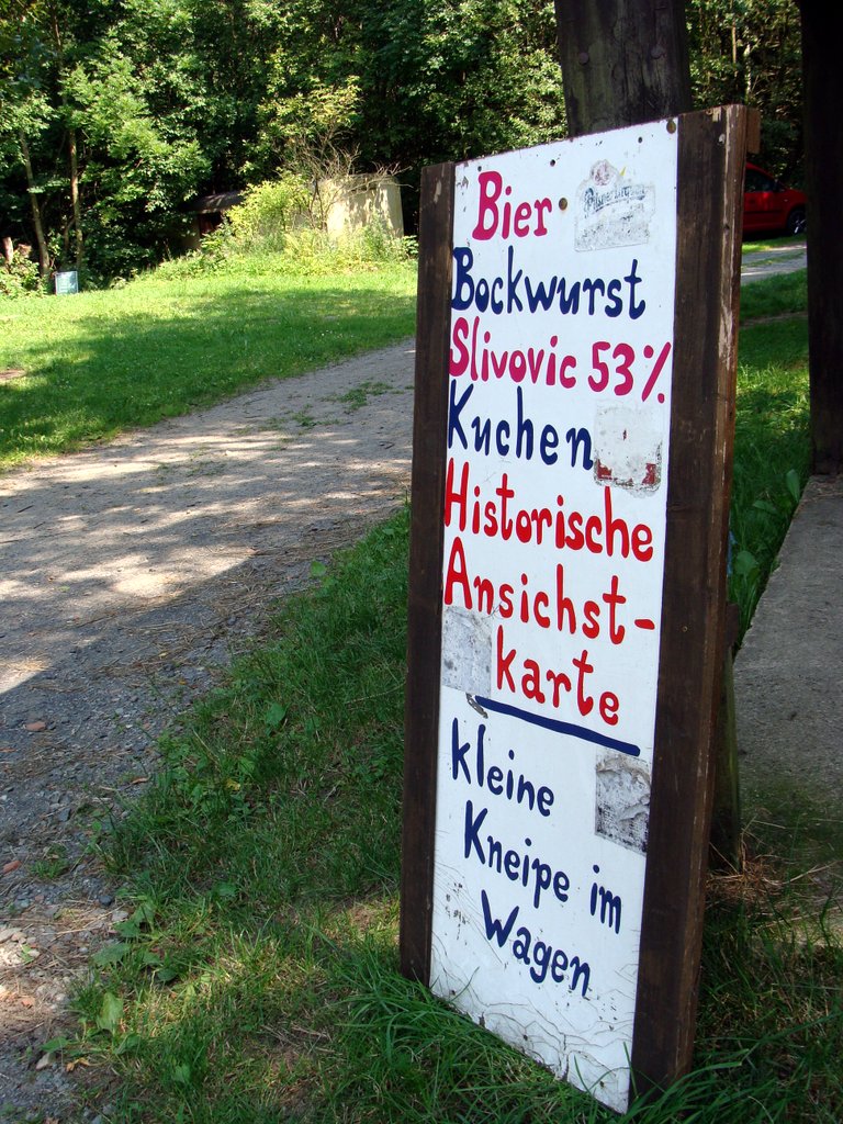 Całkiem bezboleśnie trafiliśmy na początek naszego szlaku. Nie było to jednak takie oczywiste, gdyż niemieckie oznaczenia tras to czasami łopatologiczne oznaczenia koloru szlaku, kierunku i czasu, ale równie często tablice informujące jedynie, że jest się na trasie z punktu A, przez punkt B, C do punktu D. Mapę mieliśmy czeską, okazało się więc, że tutaj pojawia się pewna trudność… Wielokrotnie nie byliśmy w stanie na szybko odnaleźć na mapie nazw wymienionych na tablicach, skrzyżowania szlaków również nie zawsze były klarowne. (Mamy jednak przeczucie, że niemieccy turyści i spacerowicze raczej nie mają takich problemów). Tam natomiast, gdzie pojawiały się oznaczenia czeskie, czuliśmy się jak w domu. Jedno jest pewne – najlepiej mieć ze sobą mapę wydaną w tym kraju, po którym się poruszamy (i ta zasada sprawdza się nie tylko w przypadku pogranicza czesko-niemieckiego, ale także przy próbach poruszania się chociażby po czeskich szlakach z polskimi mapami).