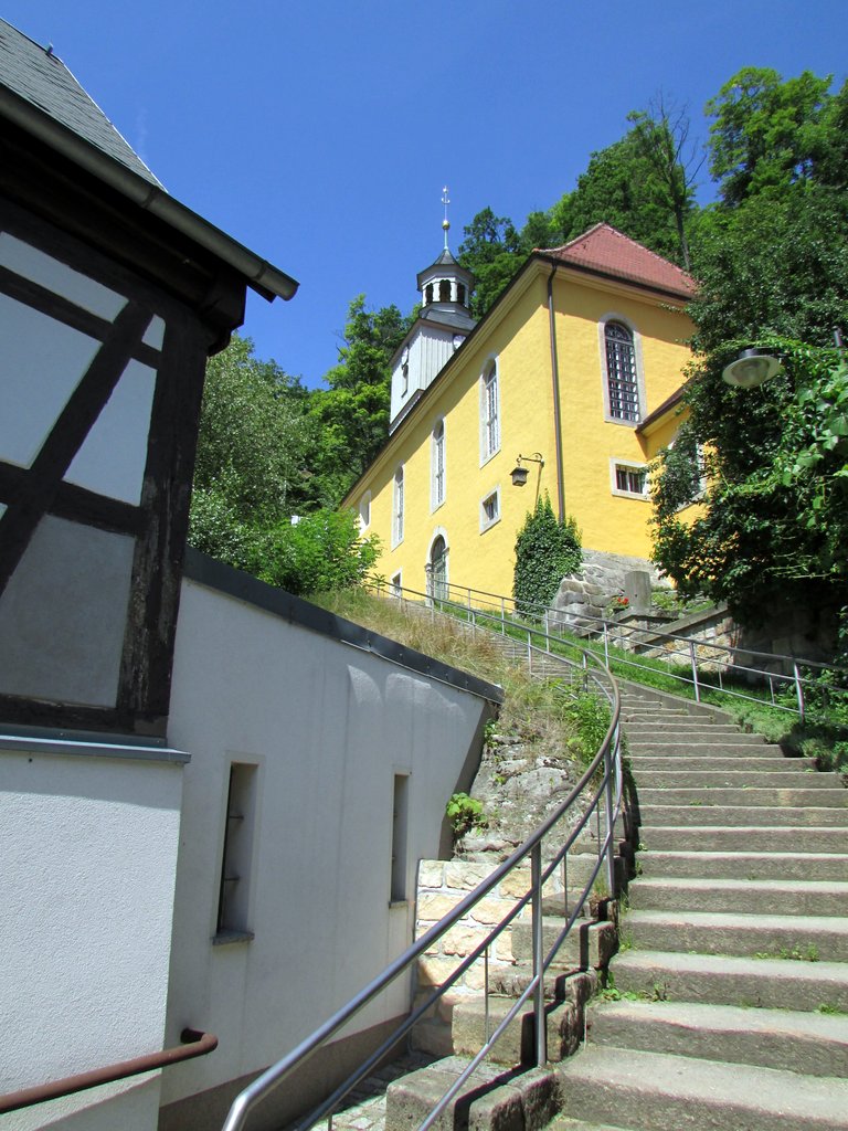 U podnóży góry Oybin znajduje się ponadto piękny kościółek. Tutaj również warto zajrzeć, choćby idąc do ruin klasztoru lub z niego wracając. Drzwi są otwarte. Ta niewielka świątynia została osadzona NA i częściowo W skale, a przejście przez środek kościoła to… schody. Uwagę przykuwa również bogata dekoracja malarska, która zaskakuje w kontraście ze skromnym wyglądem budowli od zewnątrz.