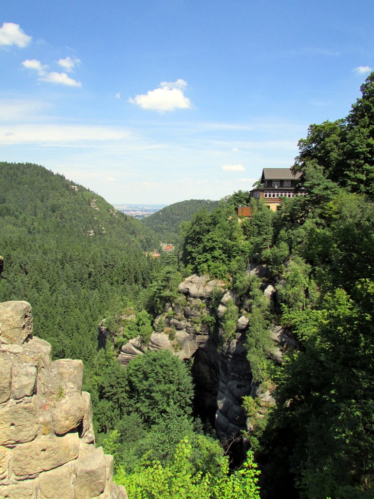 Fragment widoku ze skał Nonnenfelsen, po lewej gospoda.Mimo że ruch samochodowy na lokalnych drogach nie był za duży, spory kawałek przez naszym kempingiem znajdującym się w miejscowości Heřmanice v Podještědí, ktoś się zlitował i nas podwiózł. Drugiego dnia przez Babiččin odpočinek dotarliśmy na Hvozd (niem. Hochwald), na którego jednym wierzchołku znajduje się wieża widokowa (płatność w bufecie)…