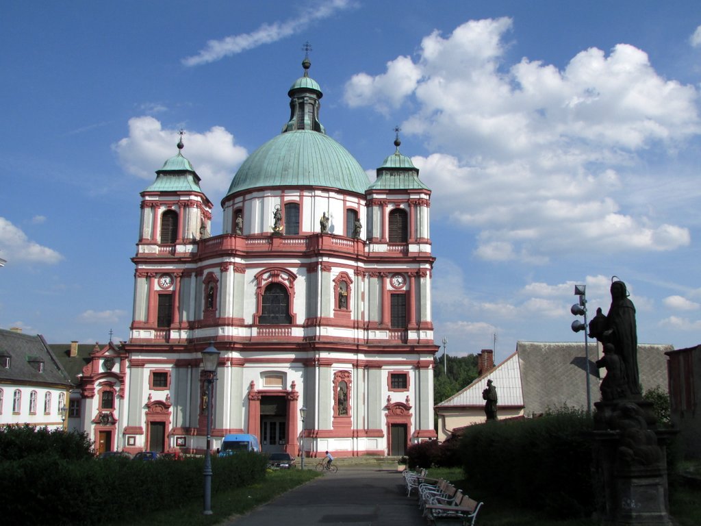 Jako że nie chcieliśmy się spieszyć, by za wszelką cenę zdążyć na pasujące nam połączenie z Hradka nad Nisou w kierunku Czeskiego Raju, musieliśmy zmienić plany. Postanowiliśmy więc „jakoś” dostać się na kemping w miejscowości Jablonné v Podještědí, a przy okazji zobaczyć to i owo. I tak zmęczeni upałem przemieszczaliśmy się – trochę po szlakach, trochę po asfalcie, a najwięcej stopem. Pomimo (a może właśnie dlatego) że z dużymi plecakami wyróżnialiśmy się spośród eleganckich, spacerujących turystów, nie mieliśmy większych problemów ze złapaniem okazji. Najpierw Niemcy, specjalnie nadkładając drogi, podwieźli nas do samej granicy z Czechami, następnie Czesi wysadzili nas dokładnie tam, gdzie był nasz nowy cel – czyli barokowy kościół św. Zdzisławy w Jablonném v Podještědí.