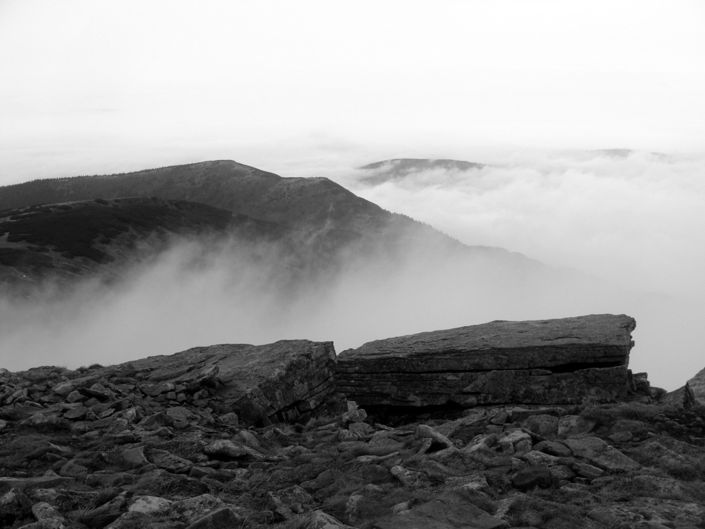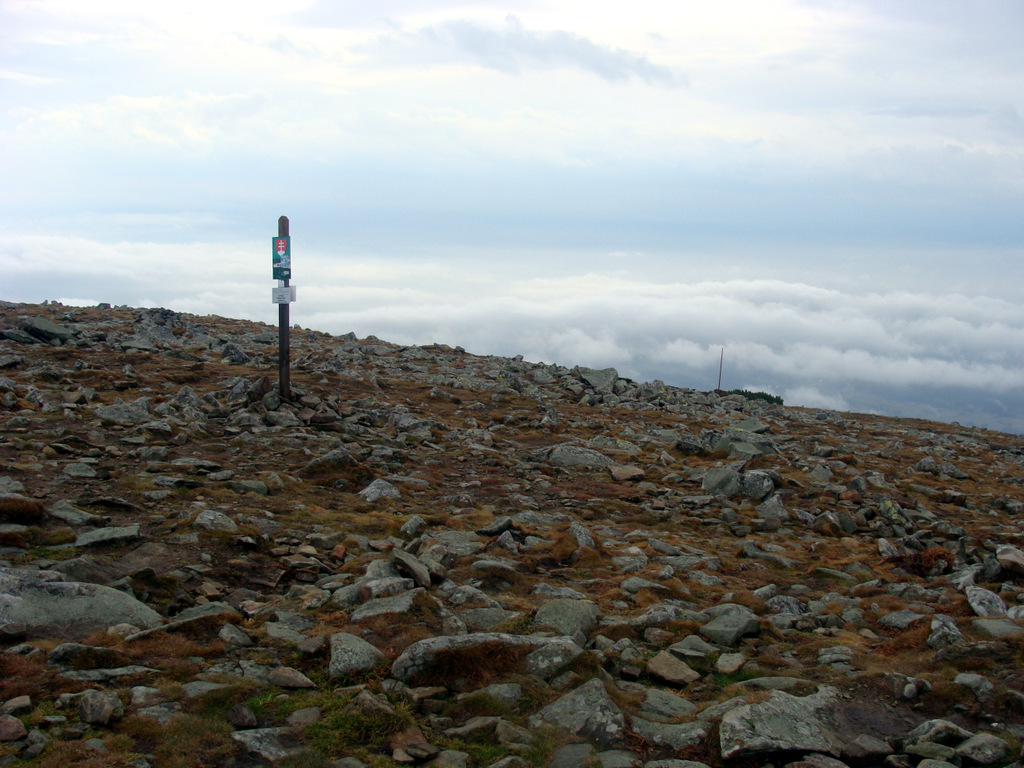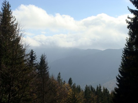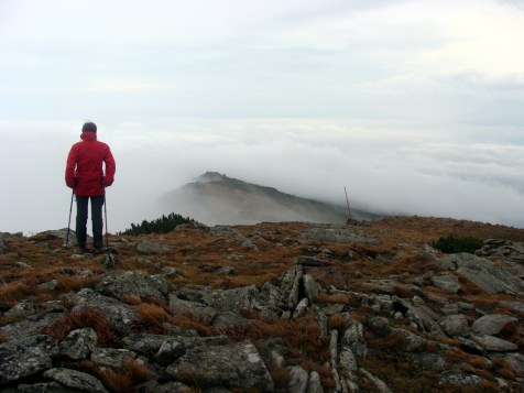 Choć bardzo się staraliśmy, nie mieliśmy szans zobaczyć Tatr. Pojawiały się i znikały sylwetki z jednej strony Pilska, po drugiej – Policy, ale większość horyzontu pokrywało morze chmur.
