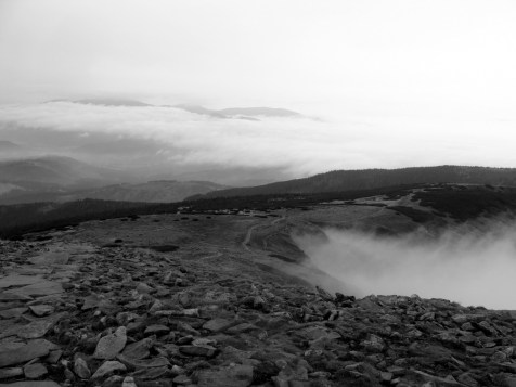Gdy wiatr powala mnie na kolana i kulę się do ziemi, przyznaję, że nie widzę sensu iść dalej. Przez chmury i wiatr próbujemy ocenić, jak daleko od szczytu jesteśmy. On mówi, że już blisko, ja mówię, że równie dobrze, przy tym wietrze może być i ze trzydzieści minut. Próbujemy na chwilę schronić się przed wiatrem. Bez sensu, z każdą chwilą bezczynności wyziębia nas coraz bardziej. Widzę, że On mógłby iść dalej. Ja nie. Zawracamy.