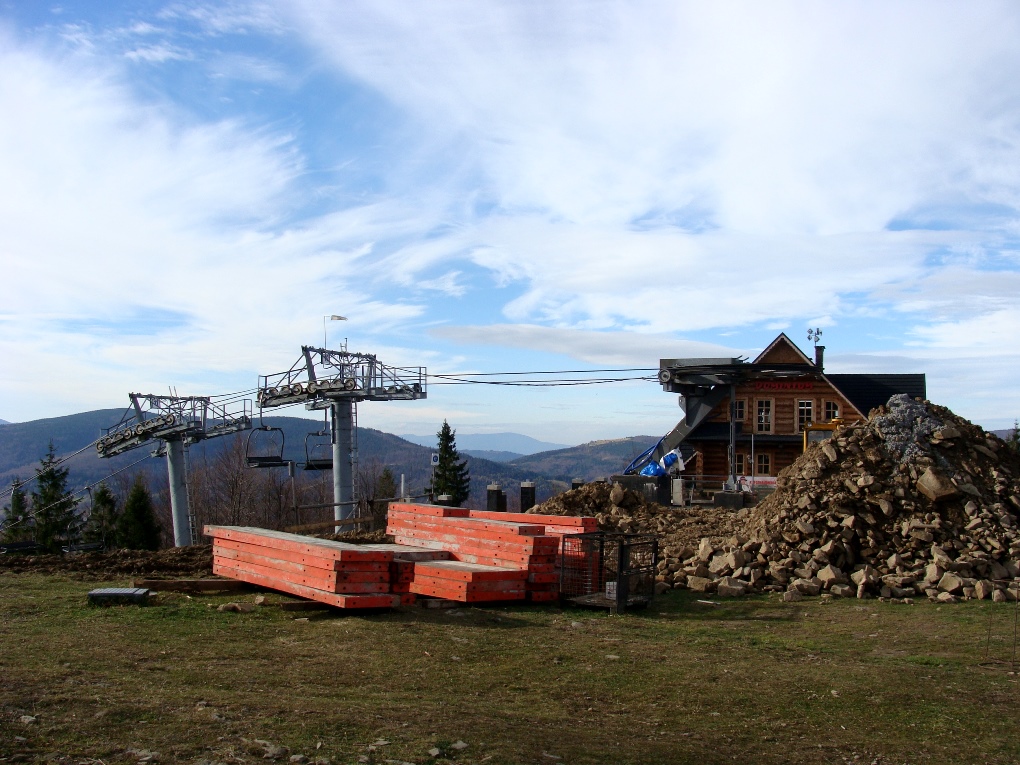 Nie lubimy stoków również poza sezonem zimowym. Unikamy. Jeśli trzeba, nadkładamy kilometrów, wybieramy mniej narzucający się wariant. Dlaczego? Ano, dlatego, że szlaki znajdujące w bezpośredniej bliskości stoków i wyciągów są zwyczajnie smutne i przeważnie bardzo męczące dla pieszego turysty. Zmęczenie związane jest przeważnie zarówno z tym, jak poprowadzony jest szlak (mozolnie pod górę nagim stokiem/wzdłuż podpór wyciągu albo nudnymi zakosami, które mają złagodzić stromiznę), jak i z tym, co widzimy po drodze. Infrastruktura stokowa to bowiem nie tylko stacja dolna-wyciąg-stacja górna, ale również ciężki sprzęt, latarnie (gdy stok jest oświetlony), karczmy, wypożyczalnie sprzętu, budki gastronomiczne, płoty, siatki, materiały budowlane… Mała próbka – poniżej.