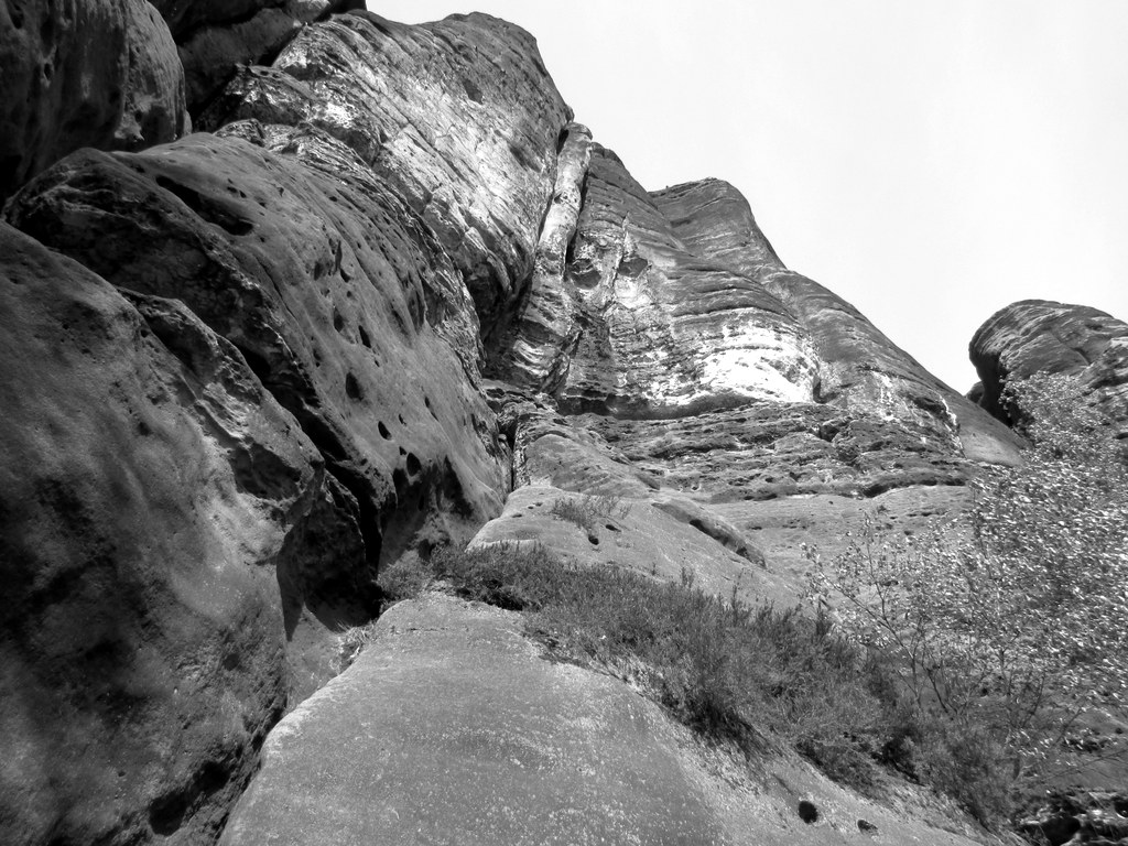 Następnego dnia naszym celem były skały Schrammsteine. Ruszyliśmy na nie niebieskim szlakiem poniżej Schrammsteinbaude. Mimo dość wczesnej pory na trasie zaczęliśmy spotykać pojedynczych ludzi. Szlak prowadził malowniczo – a to przez ładny las, a to przez wąwozy, wprowadzał do podnóży wielkich turni, gdzie od szlaku odchodziły ścieżki dostępne dla wspinaczy jako podejścia do dróg wspinaczkowych…