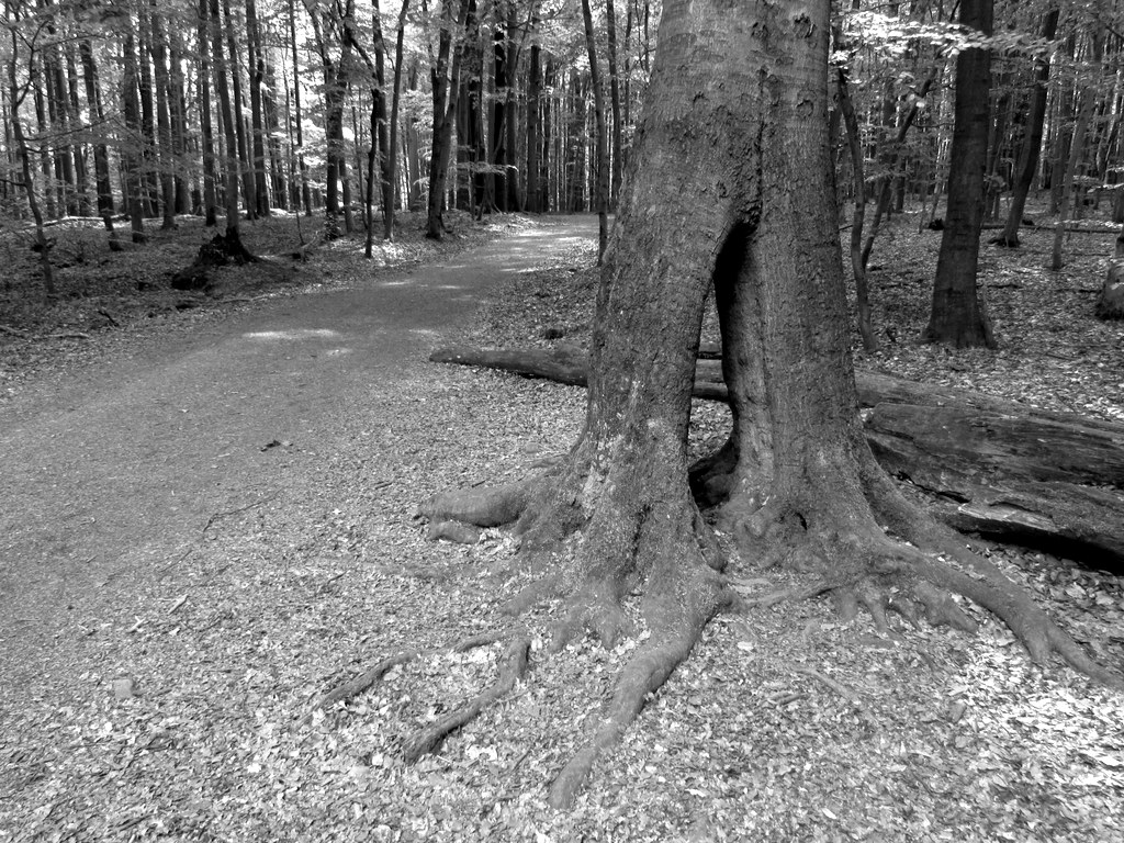 Gdy najbardziej widokowy i atrakcyjny odcinek szlaku się skończył, zaczął się wygodny leśny trakt, gdzie można było spotkać także rowerzystów. Po drodze mijaliśmy kilka ciekawostek – a to potężne drzewo tworzące z pnia bramę, przez którą może przejść dziecko…