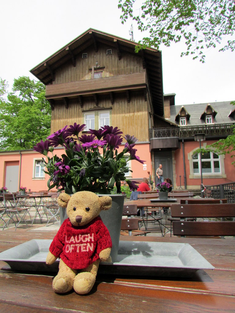 Niebieski szlak doprowadził nas do samego szczytu Grosser Winterberg, na którym miała się znajdować wieża widokowa. Jako że jest to drugi najwyższy szczyt Saskiej Szwajcarii mieliśmy nadzieję na widoki. Niestety drewniana wieża była nieczynna. Na pocieszenie stwierdziliśmy, że widok i tak już chyba zarósł, więc niewiele nas ominęło. Przysiedliśmy więc na chwilę przy zimnym piwie (ceny jak zwykle niezbyt przyjazne, więc z innych atrakcji zrezygnowaliśmy).