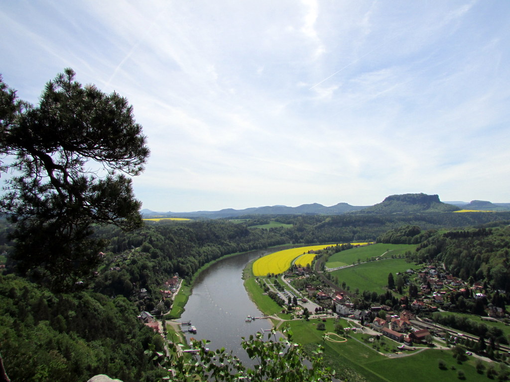 Rano udaliśmy się więc w kierunku najpopularniejszej atrakcji turystycznej regionu, czyli Bastei. Nieznakowana, ale oczywista ścieżka wzdłuż Łaby prowadziła w dużej mierze przez las wypełniony porannym śpiewem najróżniejszych ptaków. Po drodze mijaliśmy kilka niewielkich, całkiem gustownych domków letniskowych (nieco nas to zaskoczyło, bo tuż obok jest już park narodowy), by w końcu trafić na miejsce wybitnej urody. Wśród drzew i starych, potężnych rododendronów stoi tu niewielki, stuletni już domek, prywatny, letniskowy (nazywa się Lottersteighütte). W pobliżu, przy skarpie, znajdują się ogólnodostępne ławy, przy których postanowiliśmy się zatrzymać na śniadanie. Wtedy ukazał się cudowny widok – wzdłuż niebieskiej wstęgi Łaby płynęła rzeka rzepaku. Widok dopełniały oczywiście wszechobecne już tutaj skały… I chyba w tym momencie zakochaliśmy się w Saskiej Szwajcarii. Fakt, nie było to trudne. Trzeba przyznać, że mieliśmy pewnie cudowną okazję być w tym miejscu o takiej porze i to zupełnie sami (był majowy poniedziałek). Tablica koło domku z prośbą o uszanowanie jego prywatnego charakteru sugerowała wyraźnie, że w sezonie nie jest tu ani pusto, ani cicho. Tak zgadujemy.