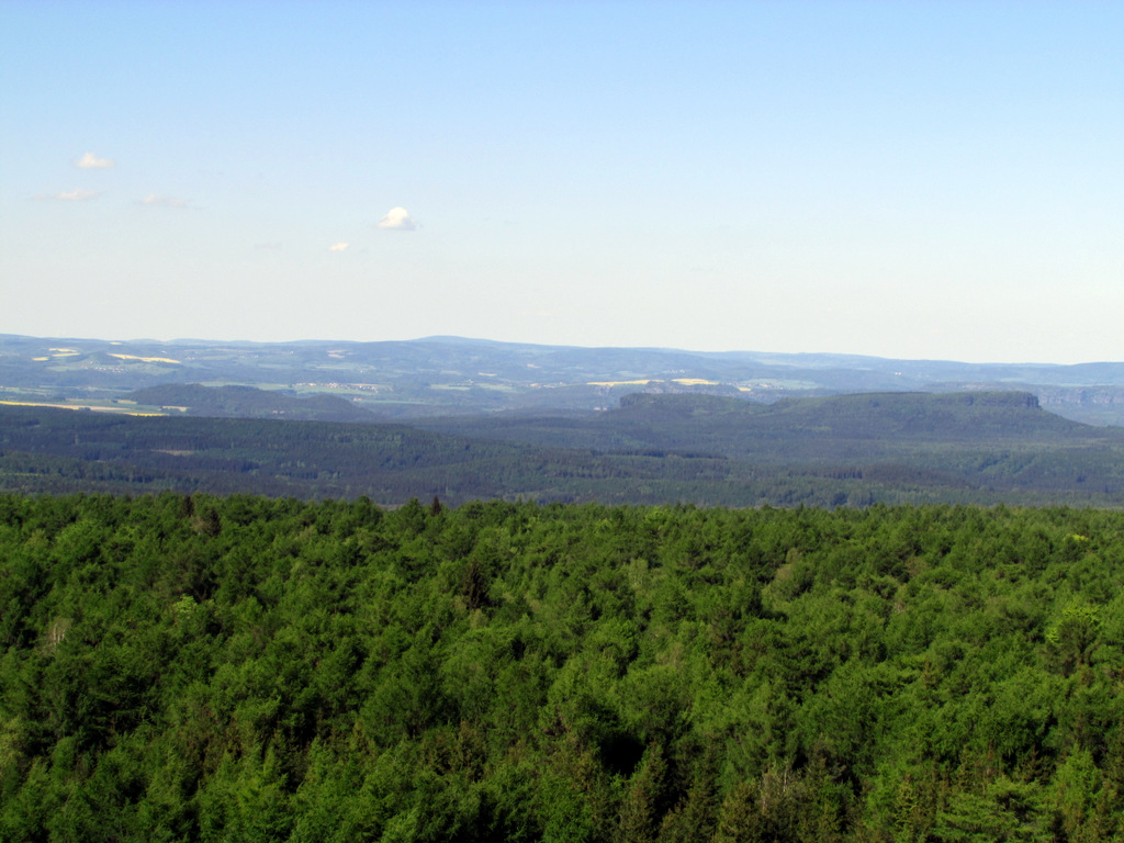 Trzeba przyznać, że lepiej byśmy tego nie wymyślili – wejście na Děčínský Sněžník było jakby idealnym podsumowaniem naszej tygodniowej wędrówki przez saskie i czeskie piaskowce. Jego widok towarzyszył nam bowiem niemal przez cały ten czas, zmieniały się tylko perspektywy i odległości – widzieliśmy go m.in. z Schrammsteinaussicht (na horyzoncie), okolic Ostrau czy z Pravčickej brány. Nabraliśmy również apetytu, by wrócić tu np. jesienią, w porze kiedy spektakle chmur i widoczność bywają najbardziej efektowne.