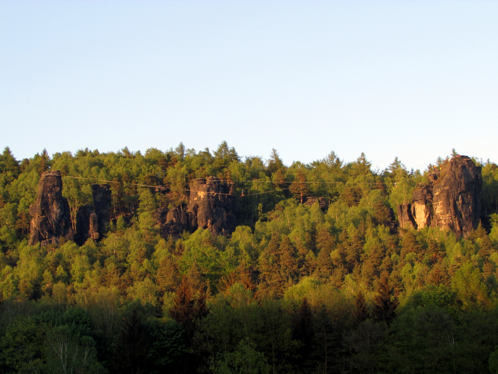 Najwyższe – i do tego stołowe – szczyty saskiej części Łabskich Piaskowców, czyli Kleine Zschirnstein i Großen Zschirnstein w końcu z drugiej strony! Na zdjęciu niemal łączą się w jedną dużą, płaską górę.