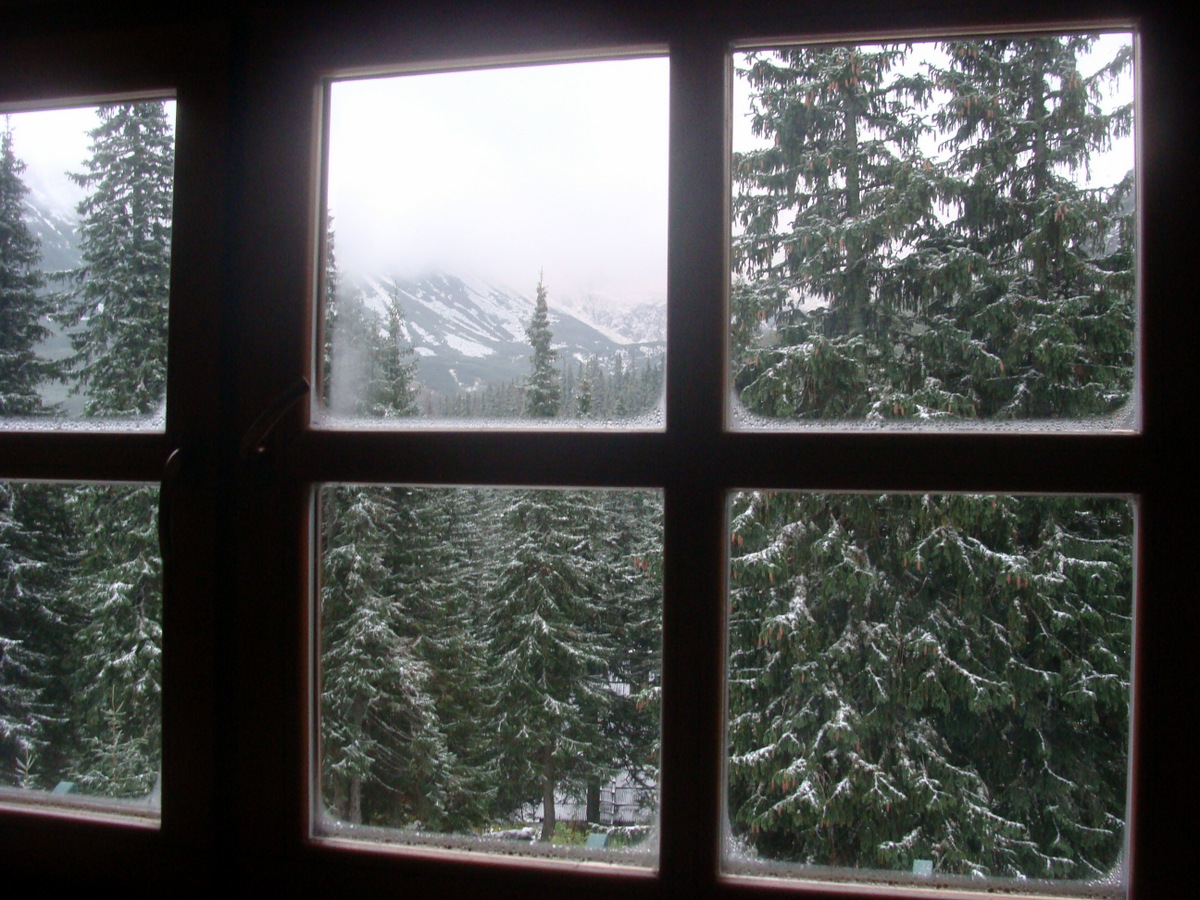 Co można zobaczyć jesienią przez okno? Ano, np. Krywań w otoczeniu pelargonii..