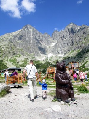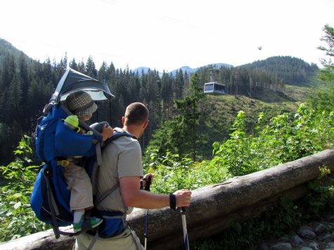 5. Ułatwienia (np. kolejki górskie) mogą się przydawać. Przykład? Próba pokonania pieszo, z dzieckiem w nosidle, koszmarnego skądinąd (dobrze nam znanego) szlaku i niemal kilometra przewyższenia z Tatrzańskiej Łomnicy nad Łomnicki Staw albo skończyłaby się dla nas odwrotem, albo uniemożliwiłaby jakąkolwiek kontynuację wycieczki Tatrzańską Magistralą. Dzięki kolejce gondolowej (fakt, za niedrobną opłatą) zaoszczędziliśmy czas oraz siły swoje i przede wszystkim dziecka. Mogliśmy spokojnie rozejrzeć i pobawić się nad Łomnickim Stawem, zjeść posiłek w Skalnatej Chacie, a następnie pójść na spacer do Zamkovskiego, gdzie też nie musieliśmy się spieszyć. My wybraliśmy powrót tą samą trasą, ze zjazdem kolejką (inną opcją mogło być też zejście na Hrebienok, skąd można by było zejść lub zjechać kolejką naziemną do Starego Smokovca). Warto wiedzieć, że w ramach infrastruktury „kolejkowej” dostępne są bezpłatnie (dla wszystkich!) m.in. toalety oraz pokój do przewijania dzieci, a także sala zabaw (może być zbawienna w razie niepogody). Gdy dodam jeszcze, że główny, potężny parking koło dolnej stacji kolei w Tatrzańskiej Łomnicy jest… bezpłatny, każdy chyba zrozumie jaka jest różnica jakościowa między tym, co u nas, a tym, co u braci Słowaków. Bynajmniej nie popieram wszystkiego, co dzieje się w słowackich górach, zwłaszcza jeśli chodzi o nadmierne rozbudowywanie stoków i wyciągów narciarskich, ułatwienia dla rodzin z dziećmi są jednak faktem.