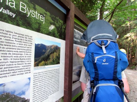 2. Zapas czasu (i jedzenia). Rzecz wydaje się oczywista dla każdego średnio nawet ogarniętego turysty górskiego, w przypadku chodzenia z małym dzieckiem nabiera szczególnego znaczenia. Wszystko dobrze, gdy mamy niemarudzące (najlepiej śpiące) dziecko w nosidle, ale gdy należy zrobić przerwę od nosidła (u nas po około godzinie)), pozostaje opcja odpoczynku lub tuptania na małych nóżkach. I jedno, i drugie wymaga dodatkowego nakładu czasu. Może się wydawać, że w łatwiejszym terenie to i owo nadrobimy, gdy maluch znów będzie grzecznie siedział w nosidle, ale bieganie z dzieckiem na plecach to naprawdę słaby pomysł. Tak czy owak, czasu należy mieć w zapasie sporo, by bez nerwowego patrzenia na zegarek zapewnić dziecku spokojne przerwy czy to na posiłek, czy po prostu na odpoczynek i zajęcie się kwiatkami, robaczkami czy stukaniem w tabliczki szlakowe/informacyjne.